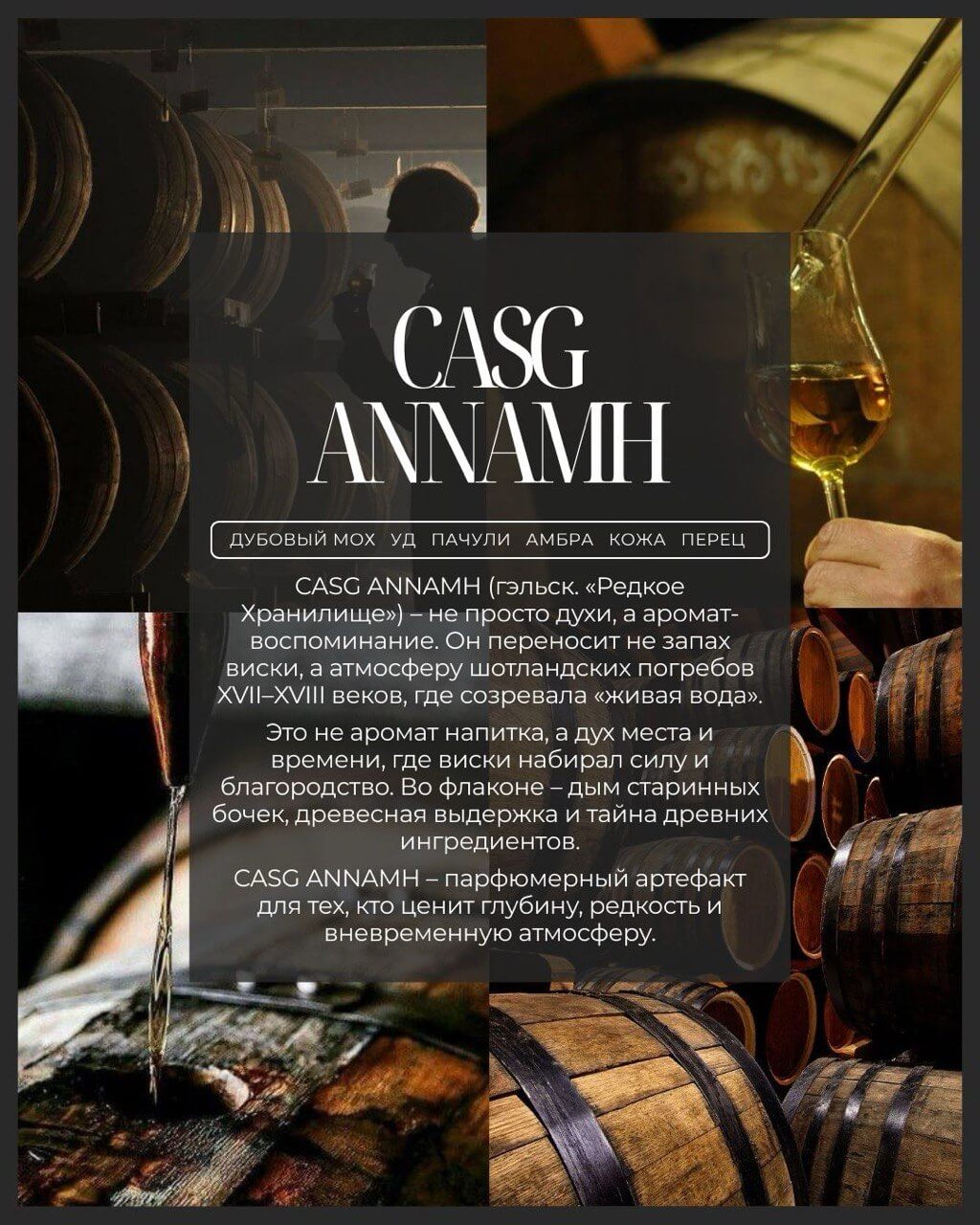 CASG ANNAMH (гэльск. «Редкое Хранилище») — не просто духи, а аромат-воспоминание. Он переносит не запах виски, а атмосферу шотландских погребов XVII-XVIII веков, где созревала «живая вода».