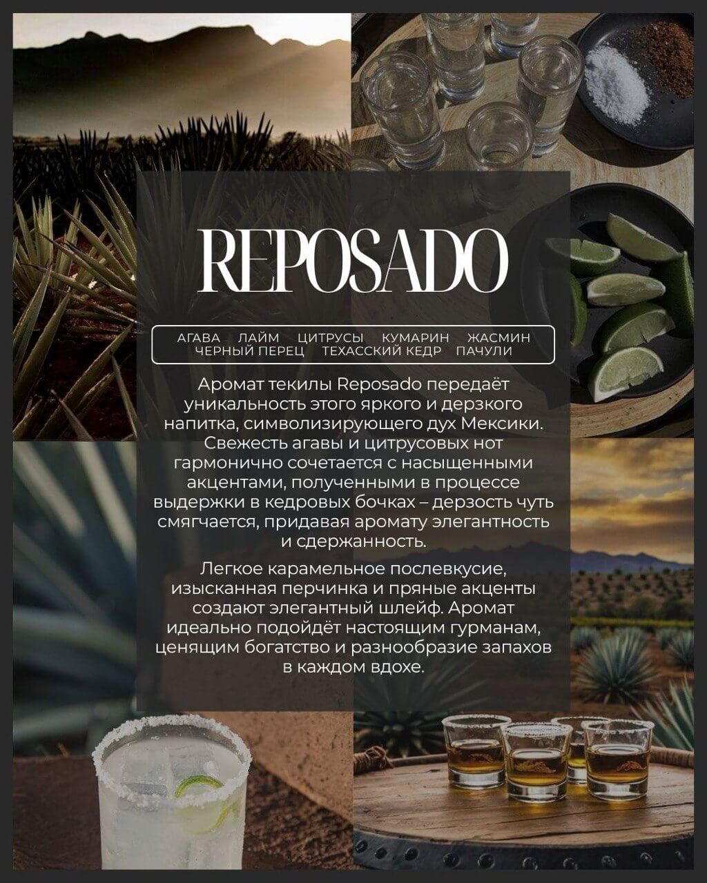Аромат текилы Reposado передаёт уникальность этого яркого и дерзкого напитка, символизирующего дух Мексики. Свежесть агавы и цитрусовых нот гармонично сочетается с насыщенными акцентами, полученными в процессе выдержки в кедровых бочках – дерзость чуть смягчается, придавая аромату элегантность и сдержанность.