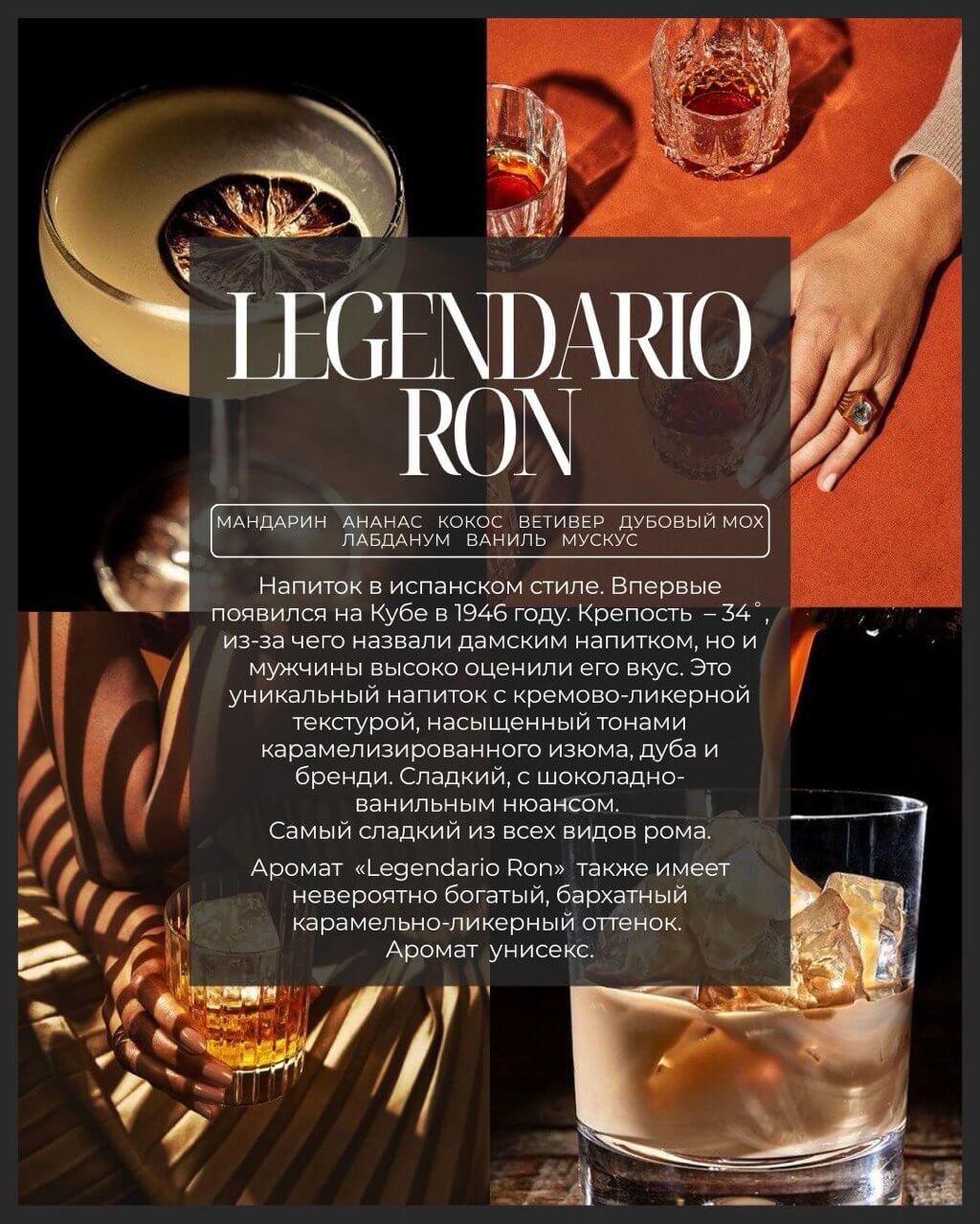 Аромат «Legendario Ron» также имеет невероятно богатый, бархатный карамельно- ликерный оттенок. Аромат унисекс.